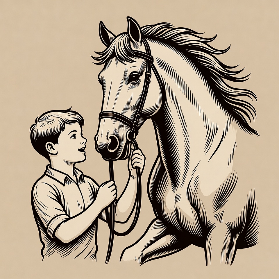 A line art illustration depicts a young boy holding the reins of a majestic horse. The boy wears a collared shirt and looks up at the horse with a smile. The horse stands tall with flowing mane and bridle on an isolated beige background.