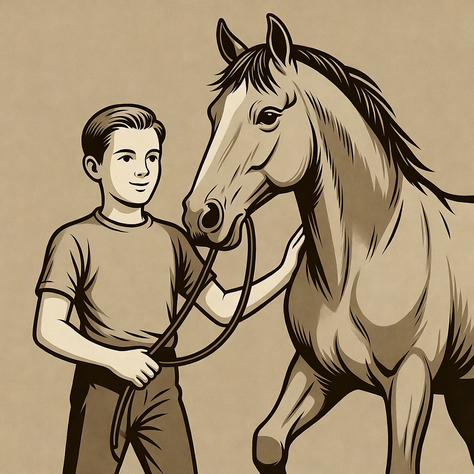 A line art illustration depicts a young boy holding a leash attached to a horse's halter. The boy wears a t-shirt and pants, smiling as he stands beside the large horse on a plain beige background. The horse has a flowing mane and is shown in a dynamic walking pose.