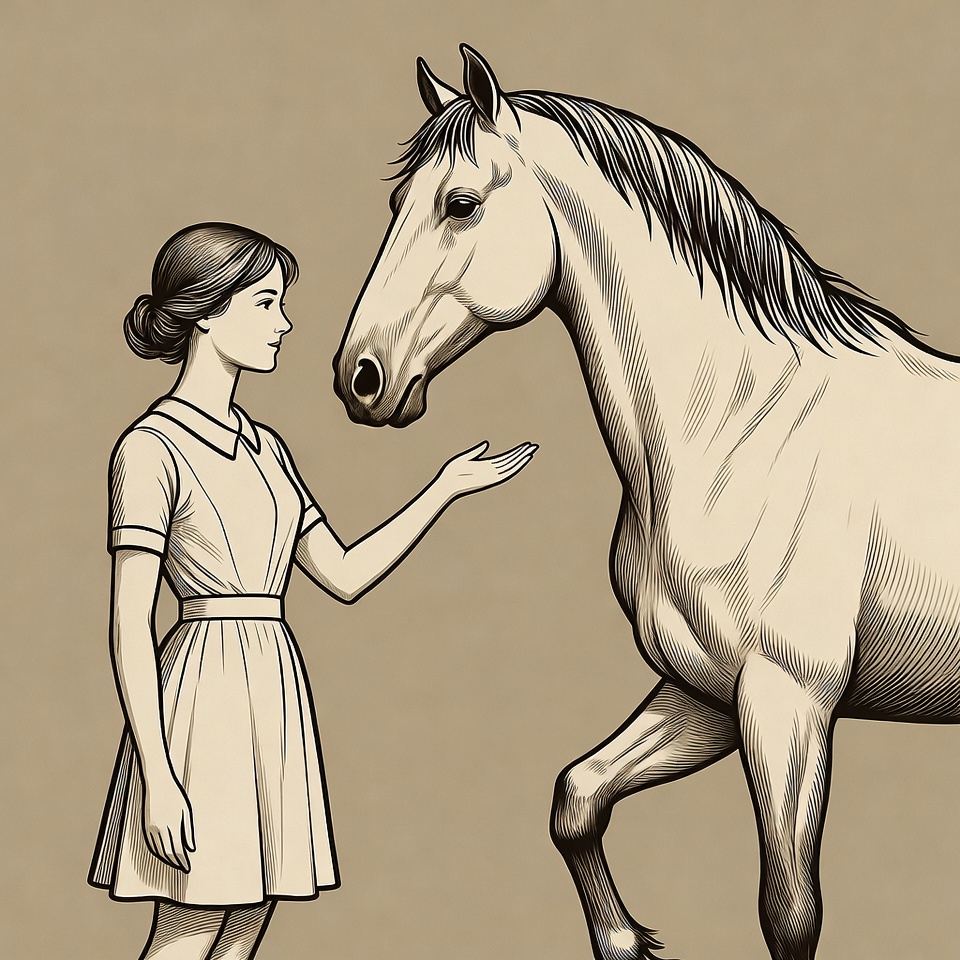 A line art illustration depicts a woman in a vintage white dress with a collar and bun hairstyle gently petting a large horse on a beige background. The horse stands tall with detailed mane and raised front leg, facing the woman closely. Her hand is extended towards the horse's muzzle in a caring gesture.