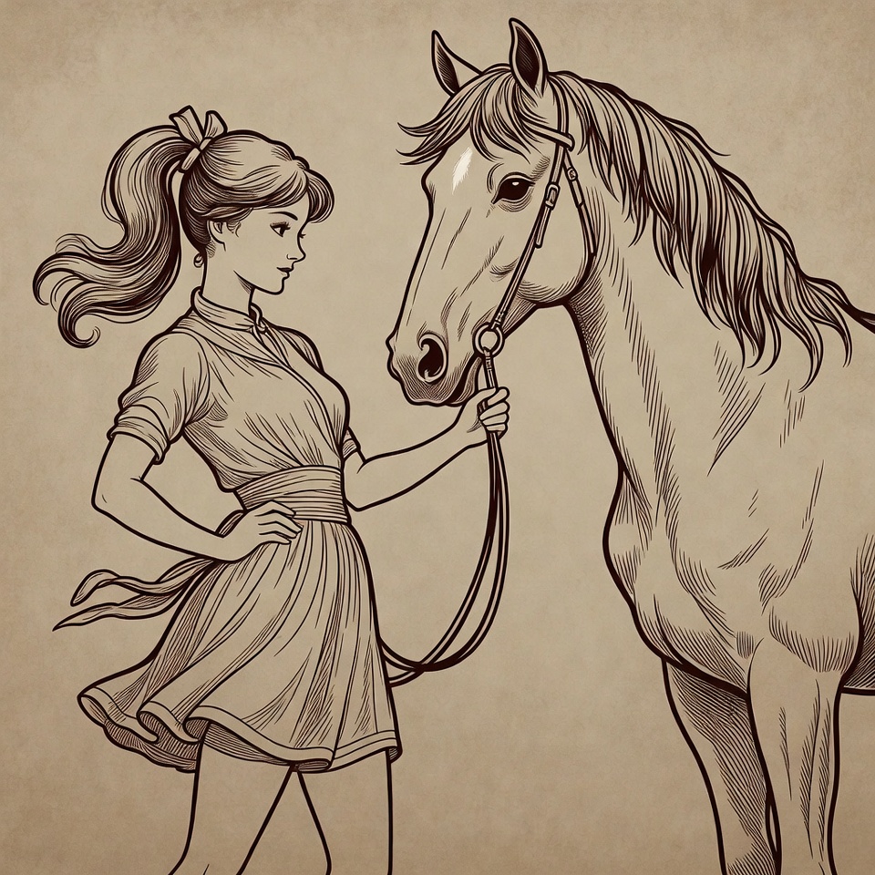 An illustration features a young White girl with a ponytail and ribbon, wearing a flowing short dress, holding the reins of a majestic horse. She stands beside the horse on a textured beige background, looking at it attentively. The artwork is rendered in detailed line art style with flowing hair and fabric.