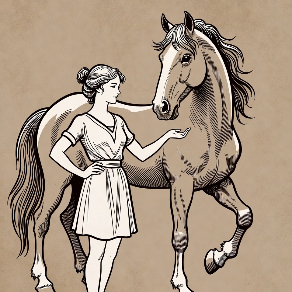 A line art illustration features a young White woman in a short white dress standing beside a large brown horse on a beige background. She has her hair in a bun and one hand extended toward the horse's muzzle while the other rests on her hip. The horse rears slightly with flowing mane and tail.