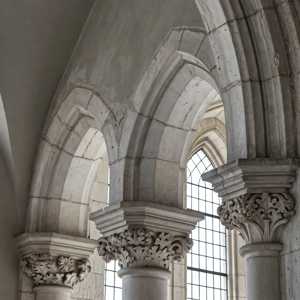 Stone Gothic arches and ornate columns rise high in a cathedral interior. Stained glass windows are framed by intricate carvings on the pillars. The architecture features pointed arches and detailed stonework in soft gray tones.