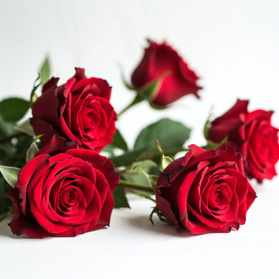 A beautiful bouquet of vibrant red roses with green stems and leaves is arranged on a plain white background. The roses feature layered petals and thorns on the stems. Several blooms are clustered together, creating an elegant floral display.