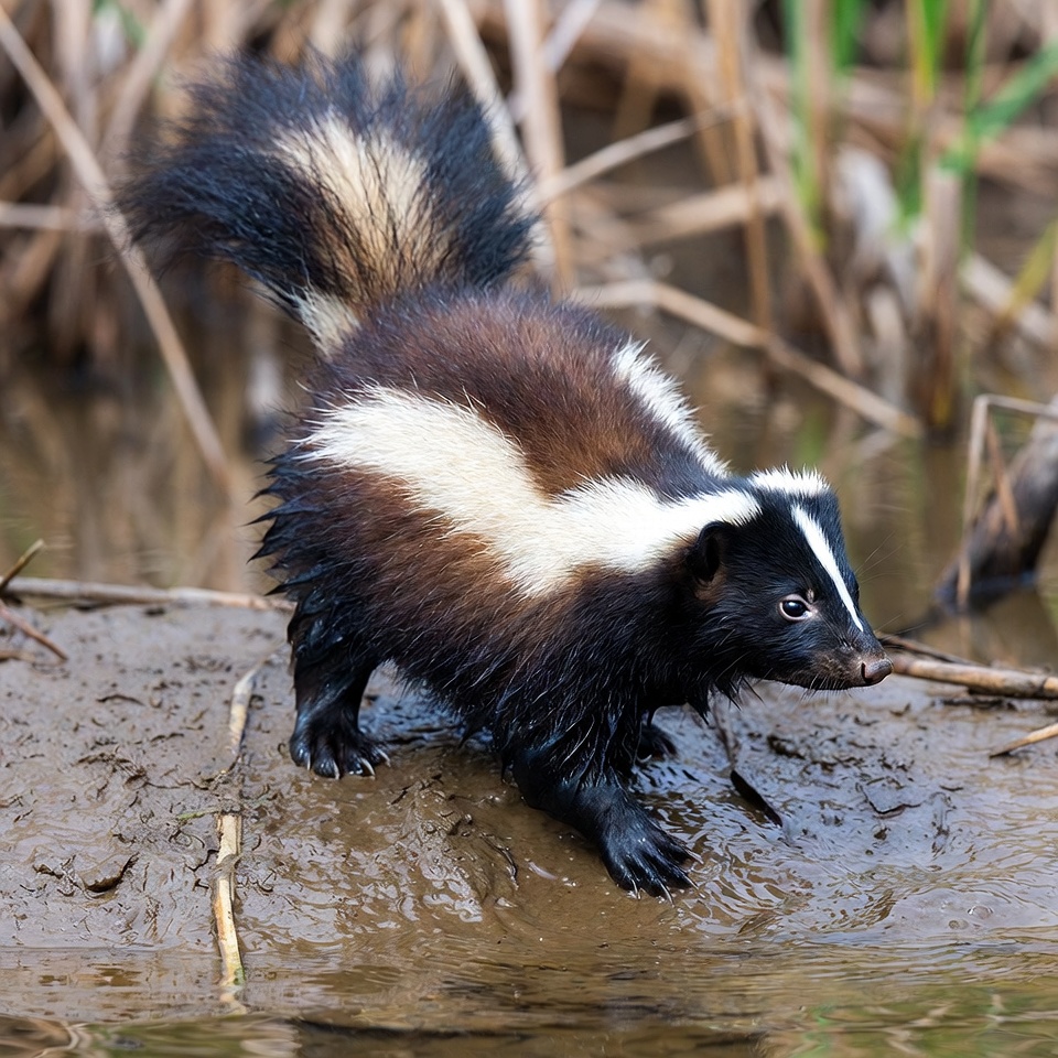 animal, baby skunk, black white fur, fluffy tail, marsh, muddy ground, nature, outdoors, reeds, striped skunk, vegetation, water, wet skunk, wildlife, skunk