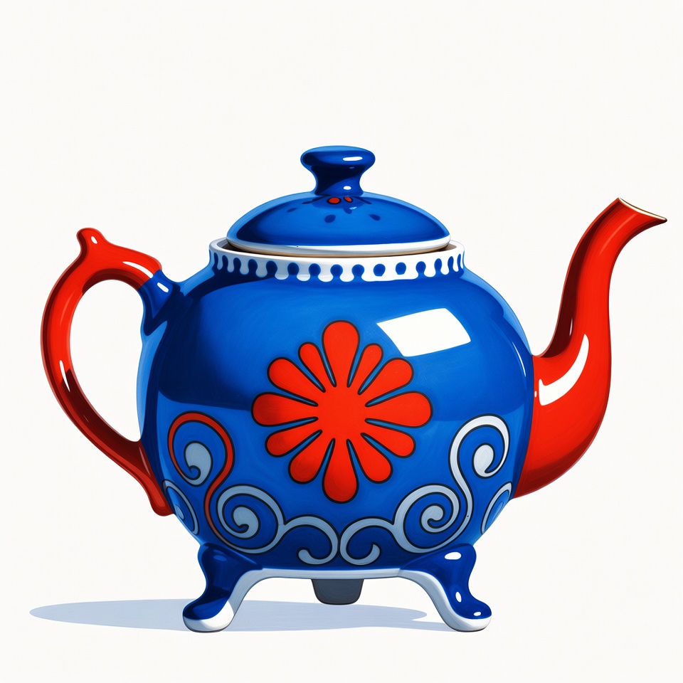 3D illustration, blue teapot, ceramic teapot, decorative teapot, flower design, glossy teapot, isolated background, kitchenware, lid, red handle, red spout, swirling patterns, tea pot, three feet, white patterns, teapot