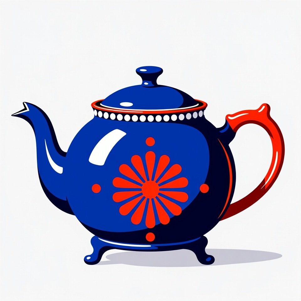 beaded trim, blue pottery, blue teapot, ceramic teapot, clipart, decorative teapot, glossy teapot, illustration, isolated object, kitchenware, red accents, red handle, starburst design, tea pot, vector art, white background, teapot
