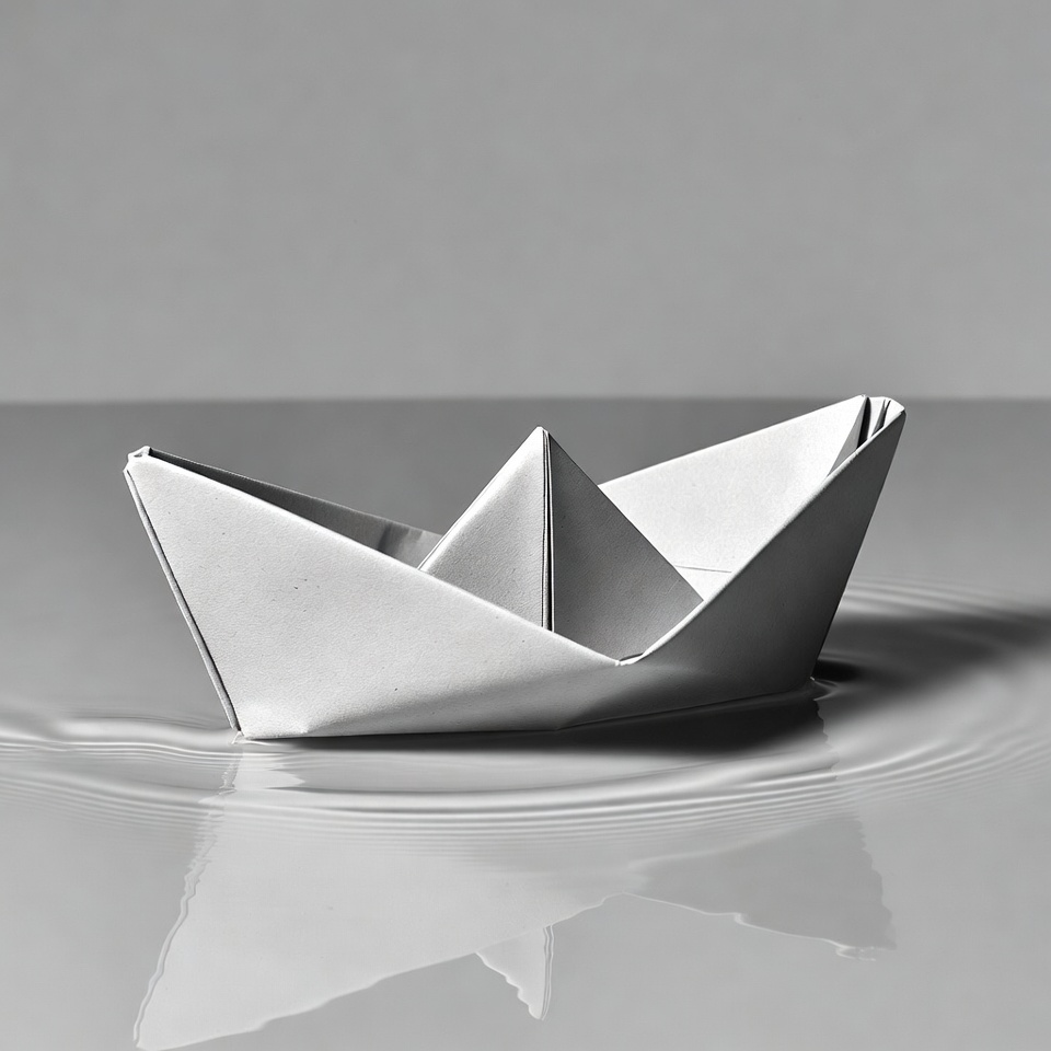 A white origami paper boat floats on a reflective gray water surface. The boat features sharp folds forming its hull and sails, captured in black and white. It is positioned against a plain gray background with subtle ripples around it.