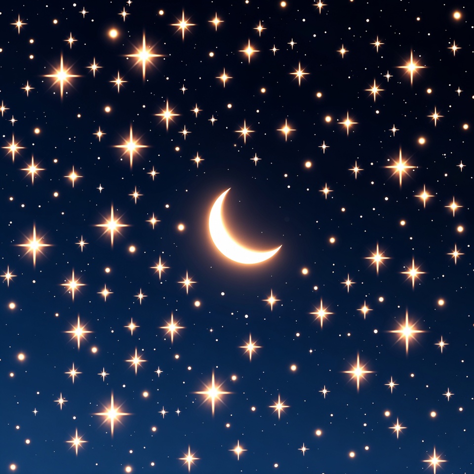 A glowing crescent moon shines brightly against a deep blue night sky filled with numerous twinkling stars. The stars are scattered densely across the background, creating a sparkling celestial scene. The image features a vibrant, illustrative style with an isolated dark background.