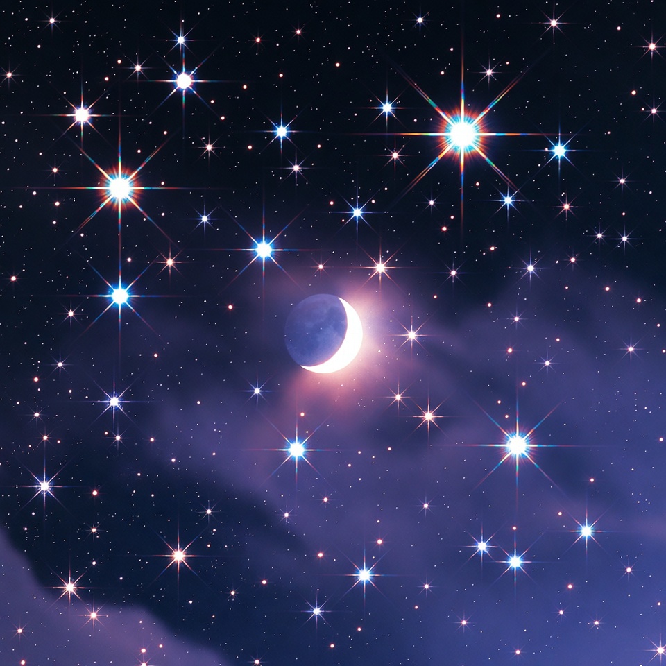 Crescent Moon and Stars in Night Sky