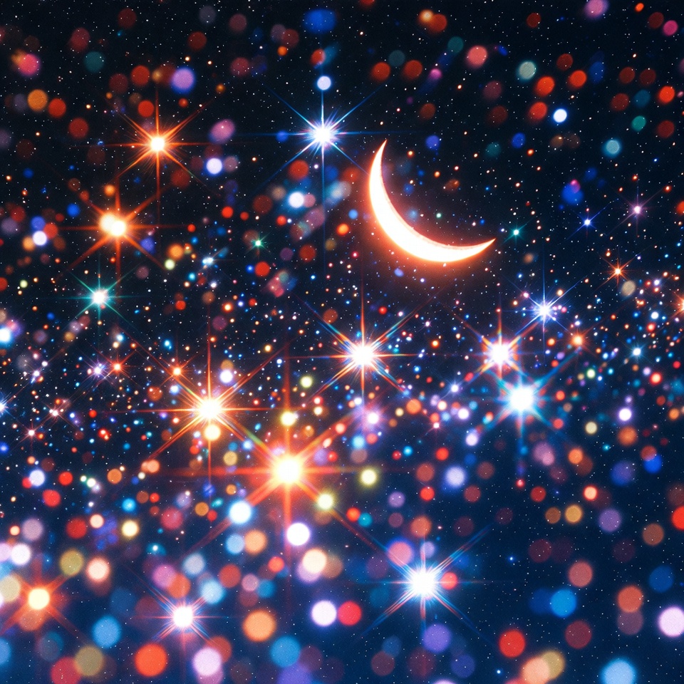 Glowing Crescent Moon in Starry Bokeh Sky