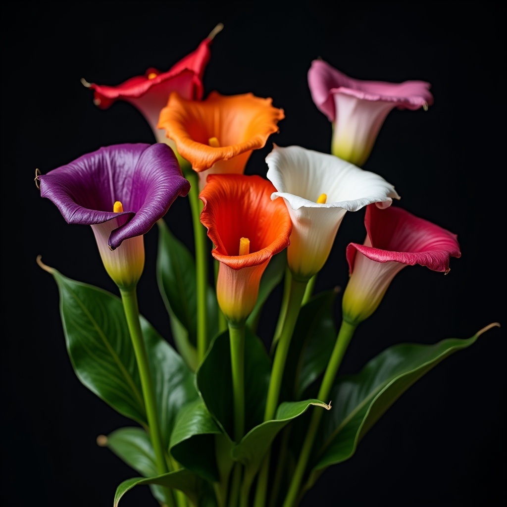 black background, bouquet, calla lily, colorful flowers, floral arrangement, flower cluster, green leaves, orange flowers, pink flowers, purple flowers, red flowers, vibrant blooms, white flowers, yellow spadix, calla lilies