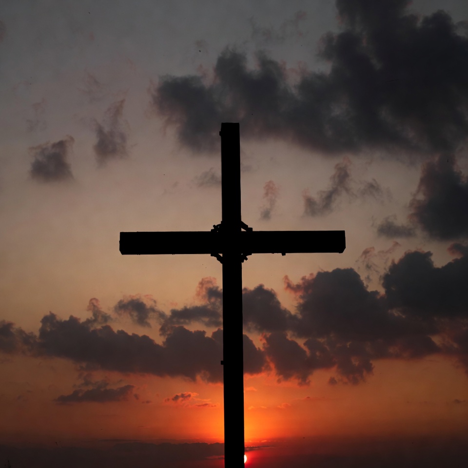 A large wooden cross stands in silhouette against a dramatic sunset sky. Dark clouds frame the cross as the sun glows orange behind it. The image captures the cross centered prominently with a cloudy horizon.