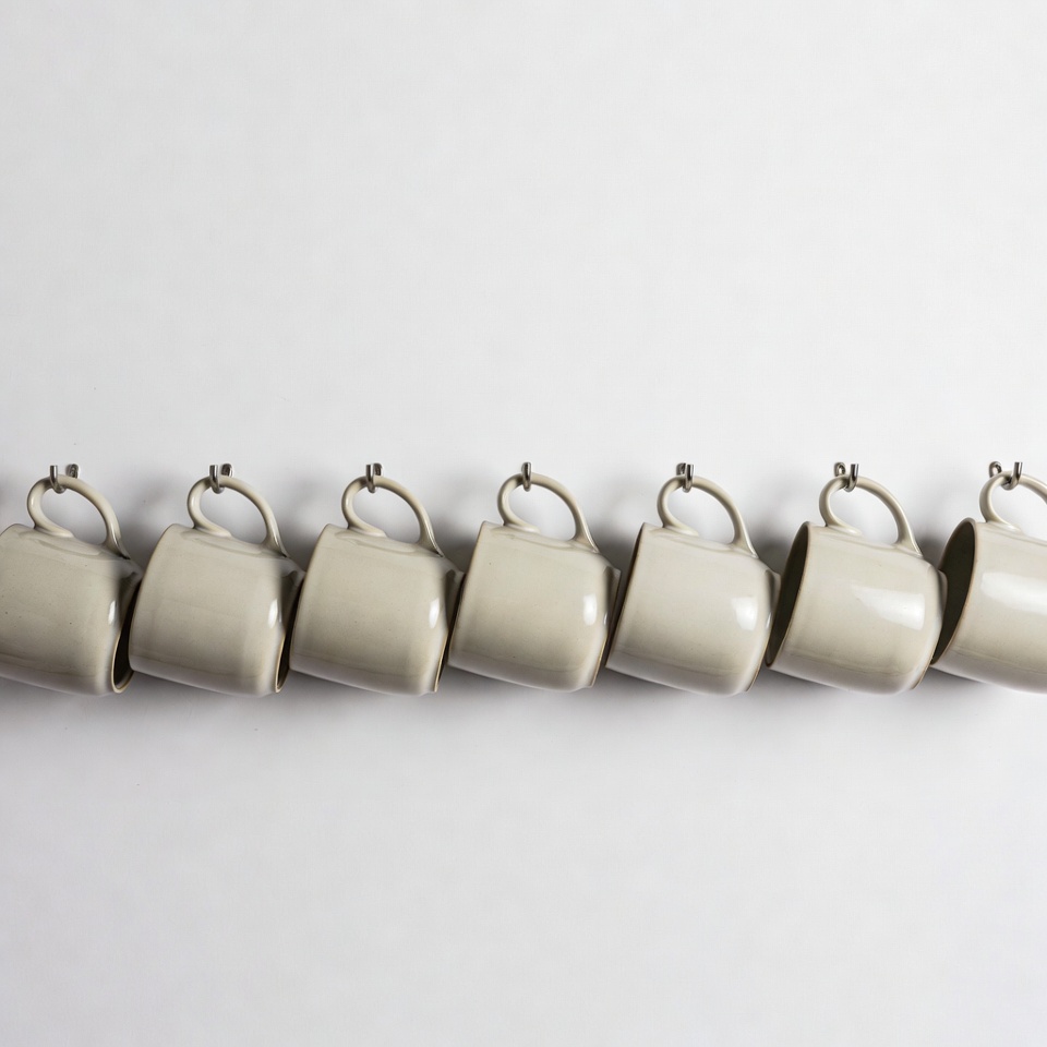 aligned mugs, beige mugs, ceramic mugs, coffee mugs, cups, dishware, handles, hanging mugs, hooks, kitchenware, minimalist, modern mugs, pottery, row of mugs, white background, mugs