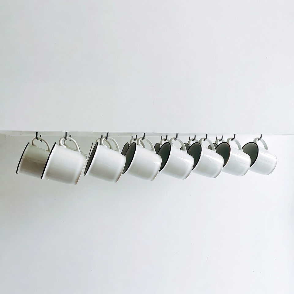 Several white enamel mugs with black rims hang upside down from a metal rack against a plain white background. The mugs are arranged in a neat row, showcasing their uniform design and glossy finish. The setup appears clean and minimalistic.