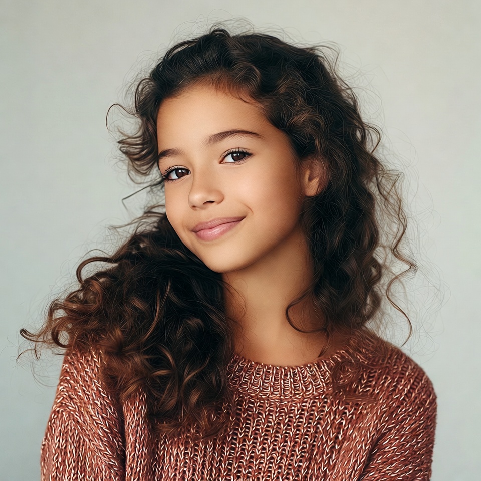 Multiracial, beautiful girl, brown hair, child portrait, close-up, curly hair, female, gentle smile, happy expression, knit sweater, light background, portrait, rust sweater, smiling girl, sweater, wavy hair, young girl, girl