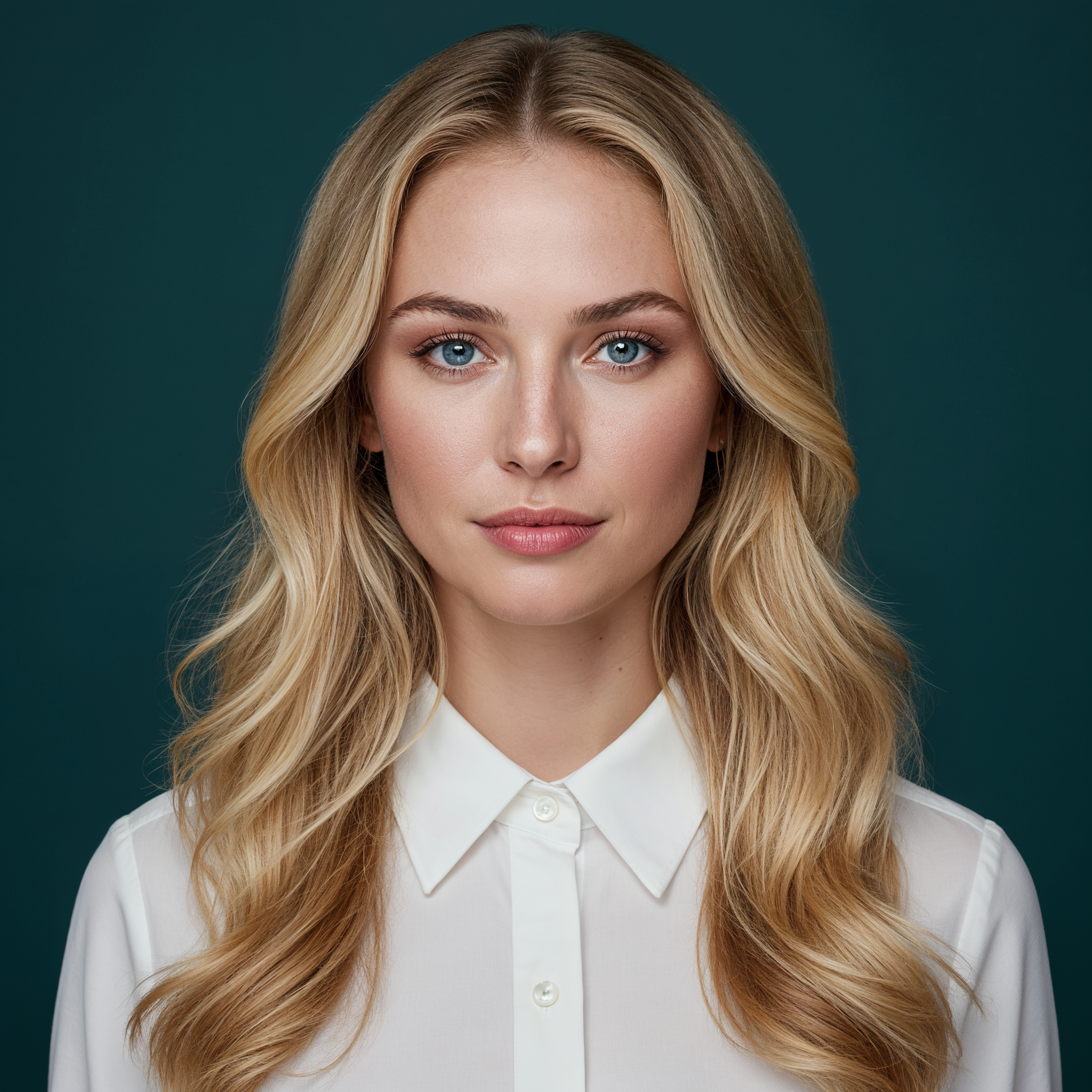 White, beautiful woman, blonde hair, blue eyes, collared shirt, fair skin, female, headshot, long hair, portrait, teal background, wavy hair, white shirt, young woman, woman