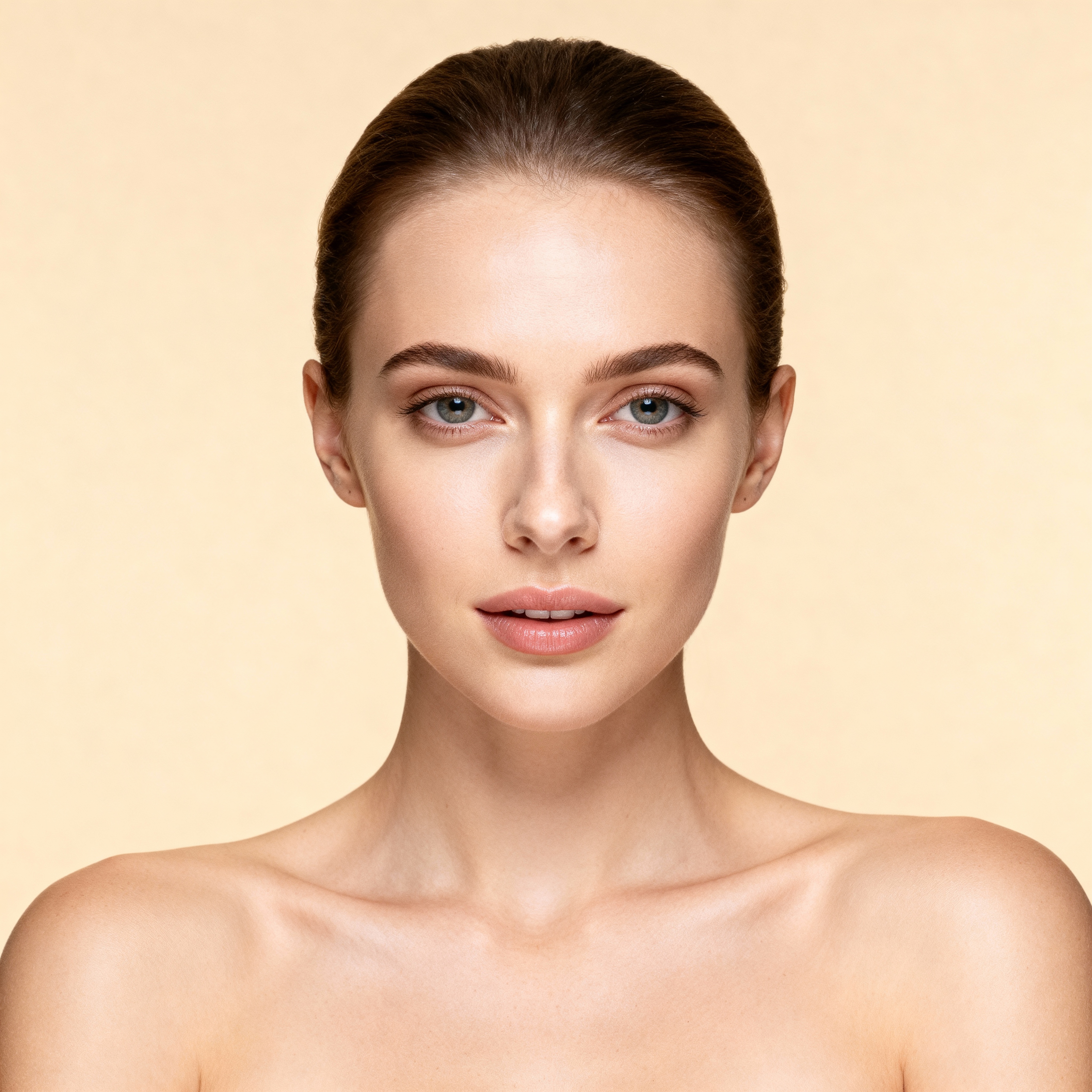 A young woman with long brown hair pulled back into a sleek ponytail gazes directly at the camera. She has light skin, green eyes, and subtle makeup with pink lips. The portrait is set against a plain beige background, showing her bare shoulders.