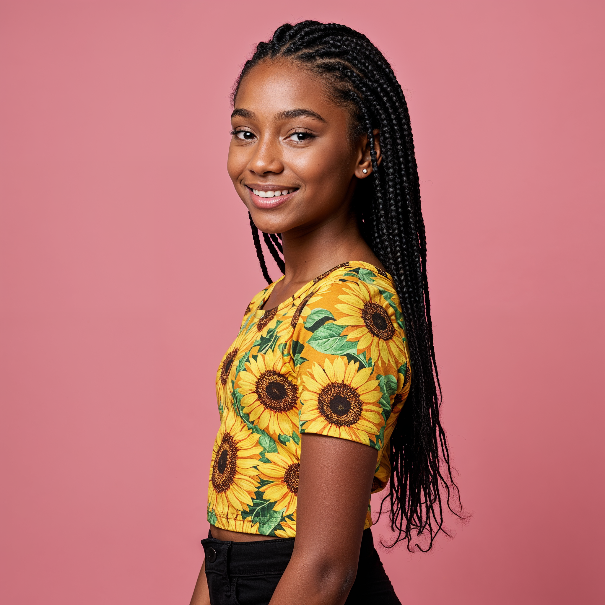 African-American, black shorts, box braids, braided hair, braids, casual wear, cornrows, fashion, female, floral shirt, happy, long hair, pink background, portrait, short sleeves, side profile, smiling, studio photo, sunflower top, vibrant colors, yellow top, young girl, girl