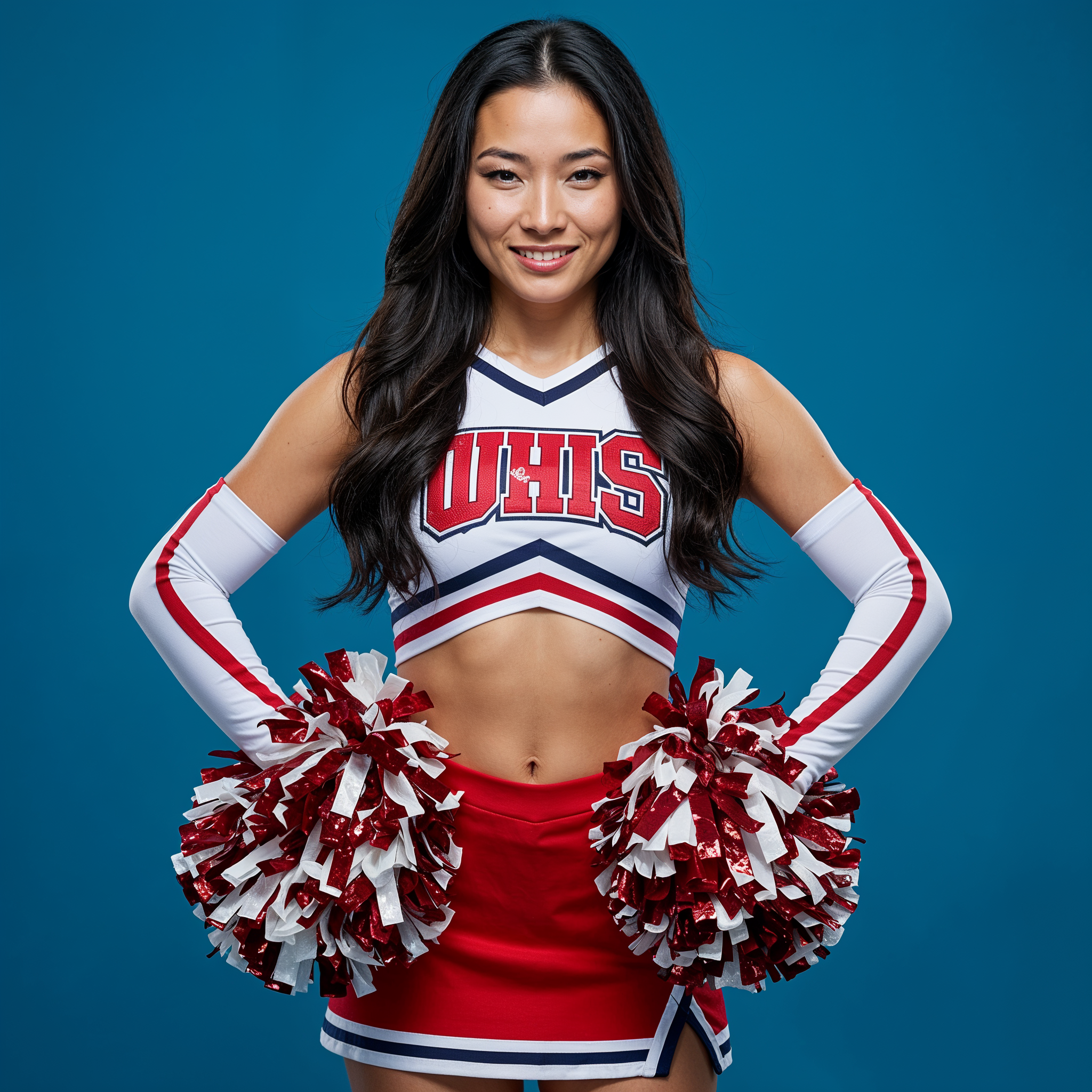 Asian, Asian woman, WUHS, arm sleeves, blue background, cheerleader pose, cheerleading uniform, cropped top, female, high school cheerleader, long black hair, pom poms, red skirt, red white pom-poms, smiling, toned abs, white top, cheerleader