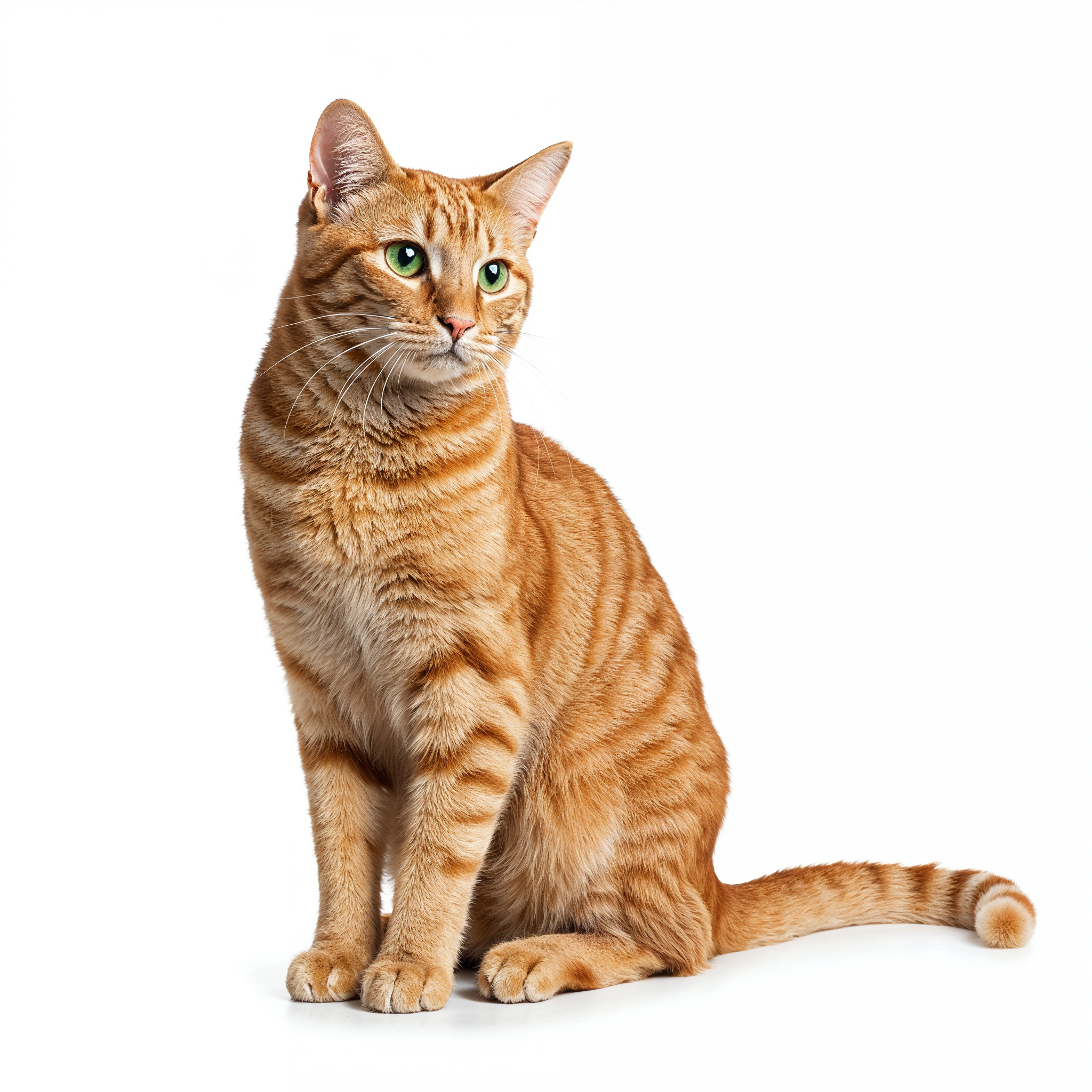 An orange tabby cat with green eyes sits upright on a white background. Its fur features bold dark stripes on a light orange coat. The cat gazes forward attentively with perked ears.