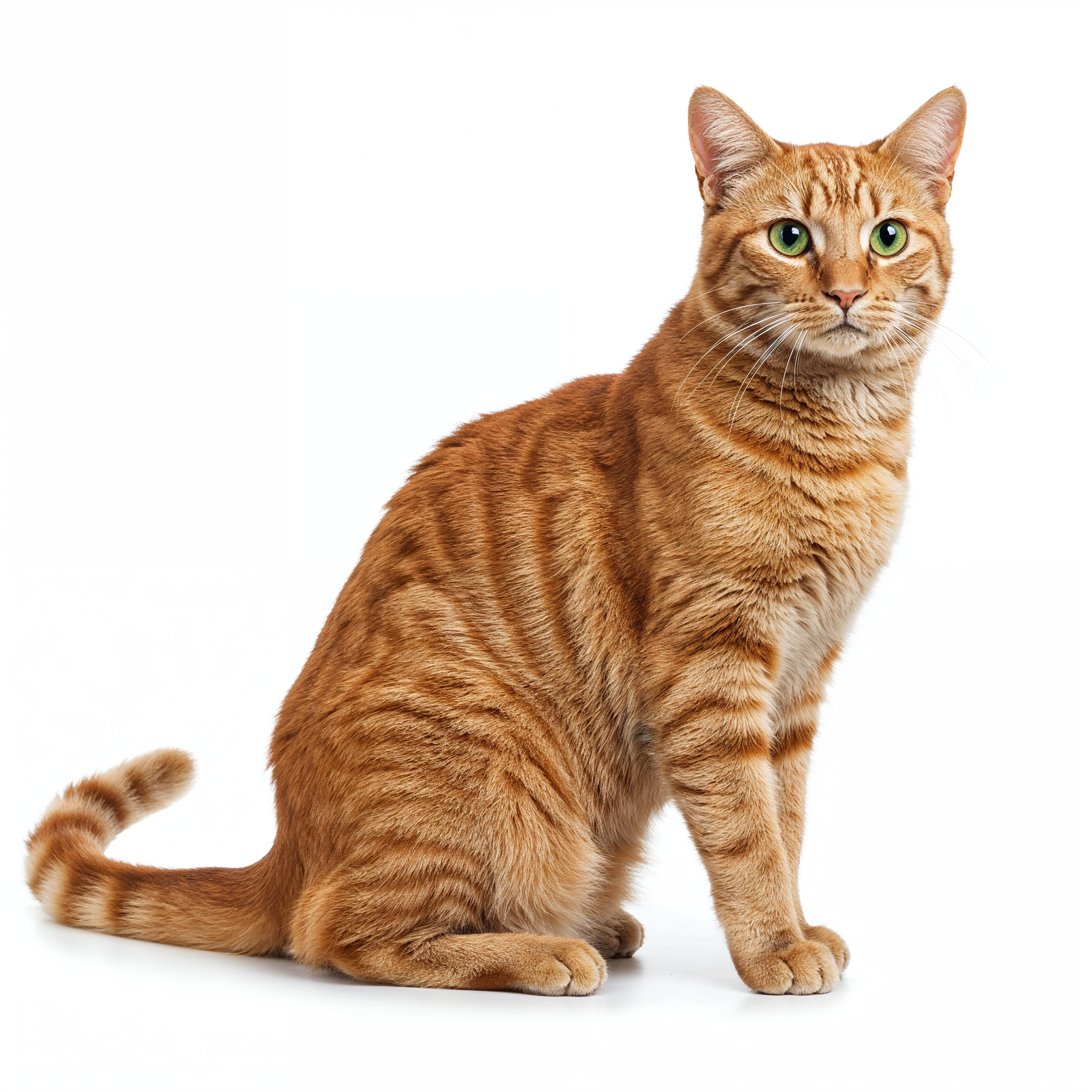 A vibrant orange tabby cat with green eyes sits upright on a white background. Its striped fur gleams, and its tail curls neatly behind it. The cat faces forward with a direct gaze.