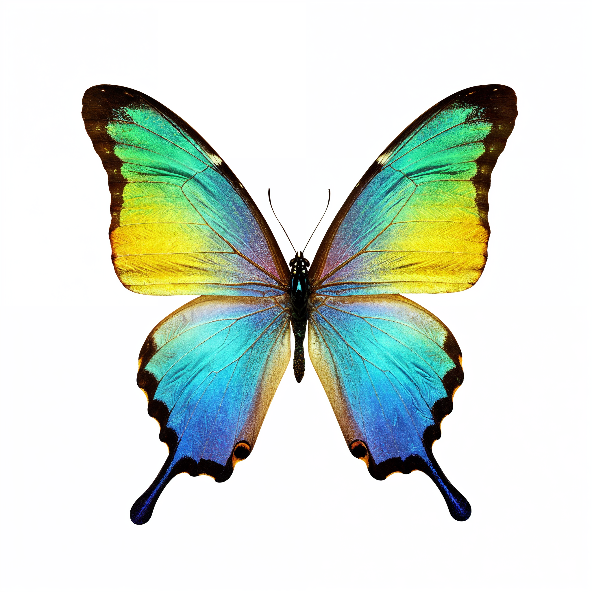 Morpho butterfly, blue wings, colorful butterfly, green wings, insect, iridescent wings, isolated background, macro, nature, tropical butterfly, vibrant colors, wildlife, wings spread, yellow wings, butterfly