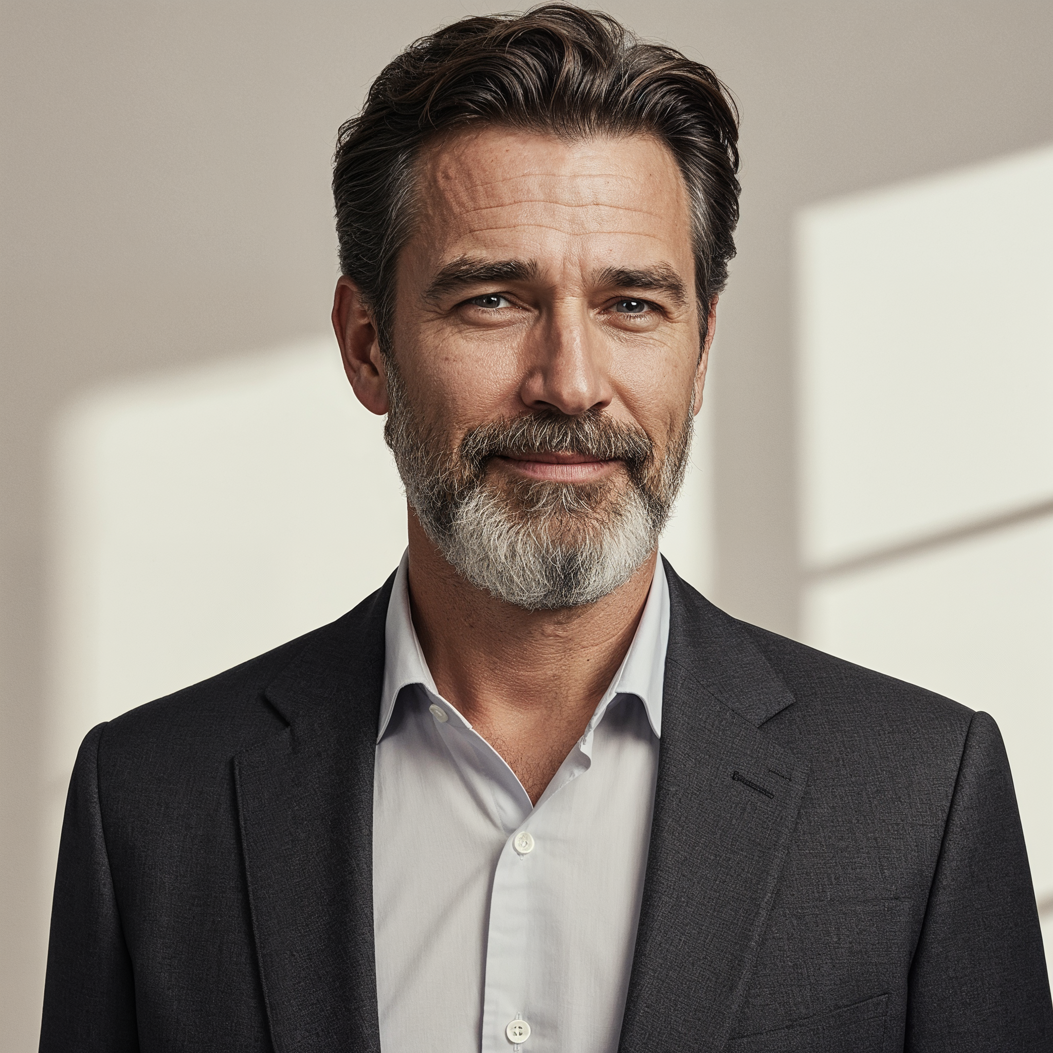 A mature man with neatly styled dark hair and a salt-and-pepper beard stands confidently against a plain background. He wears a dark gray suit jacket over a light blue dress shirt with the top button undone. Soft window light casts subtle shadows across his face, highlighting his strong jawline and direct gaze.
