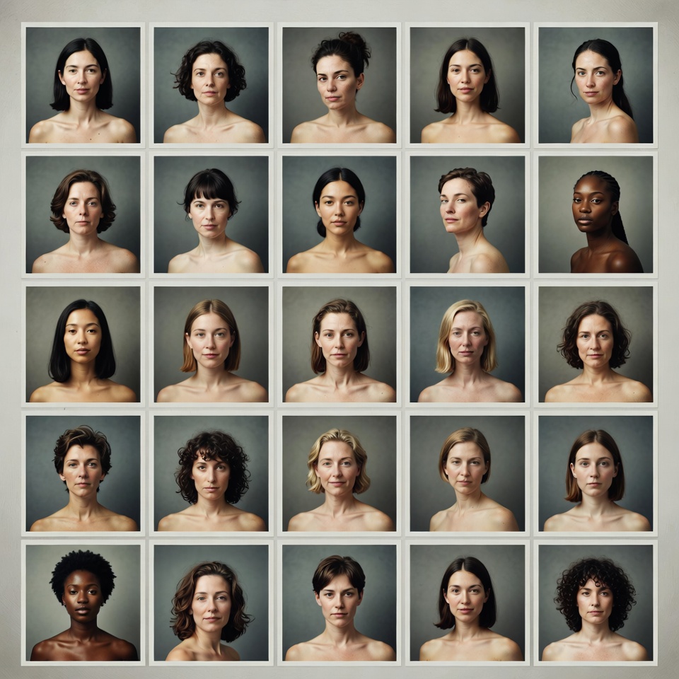 African-American, Asian, Multiracial, White, blonde, brunette, close-up, curly hair, diverse women, ethnic diversity, face photos, female, gray background, grid, hairstyles, headshots, long hair, neutral expression, photo grid, portraits, short hair, shoulders up, straight hair, woman portraits, women