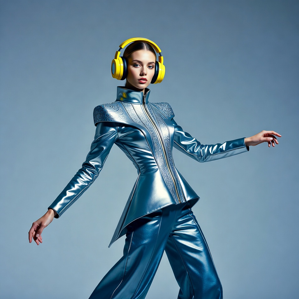 A young woman with long dark hair wears bright yellow over-ear headphones and poses dynamically against a blue background. She is dressed in a futuristic shiny blue jacket with intricate patterns and matching pants. Her expression is confident as she extends her arms gracefully.