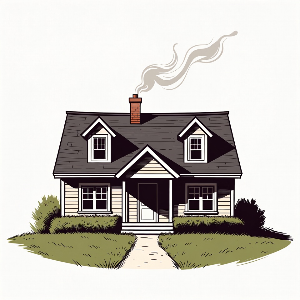 An illustration of a cozy two-story house with a sloped gray roof and red brick chimney emitting curling smoke. The house features white siding, multiple windows, a front door with a small porch, and is surrounded by green bushes and grass with a stone path leading to the entrance. It is depicted on an isolated white background in a simple line art style.