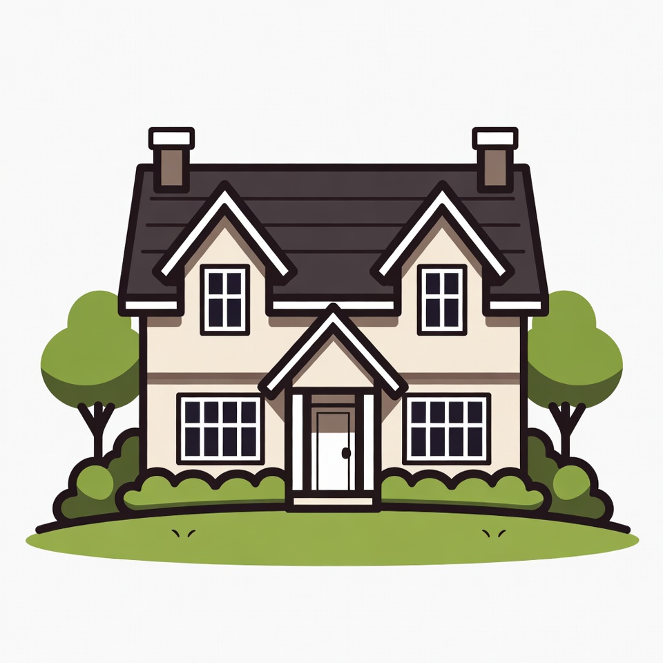 Cartoon House with Trees and Lawn