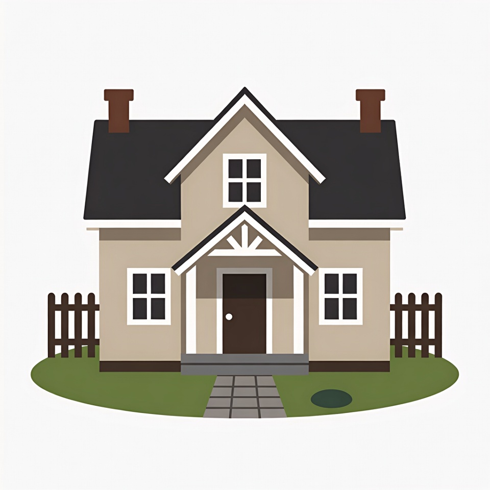 A simple clipart illustration shows a two-story beige house with a black roof and two chimneys. It features a front porch with a brown door, white-framed windows, and a white picket fence surrounding a green lawn. A stone pathway leads to the entrance on an isolated white background.