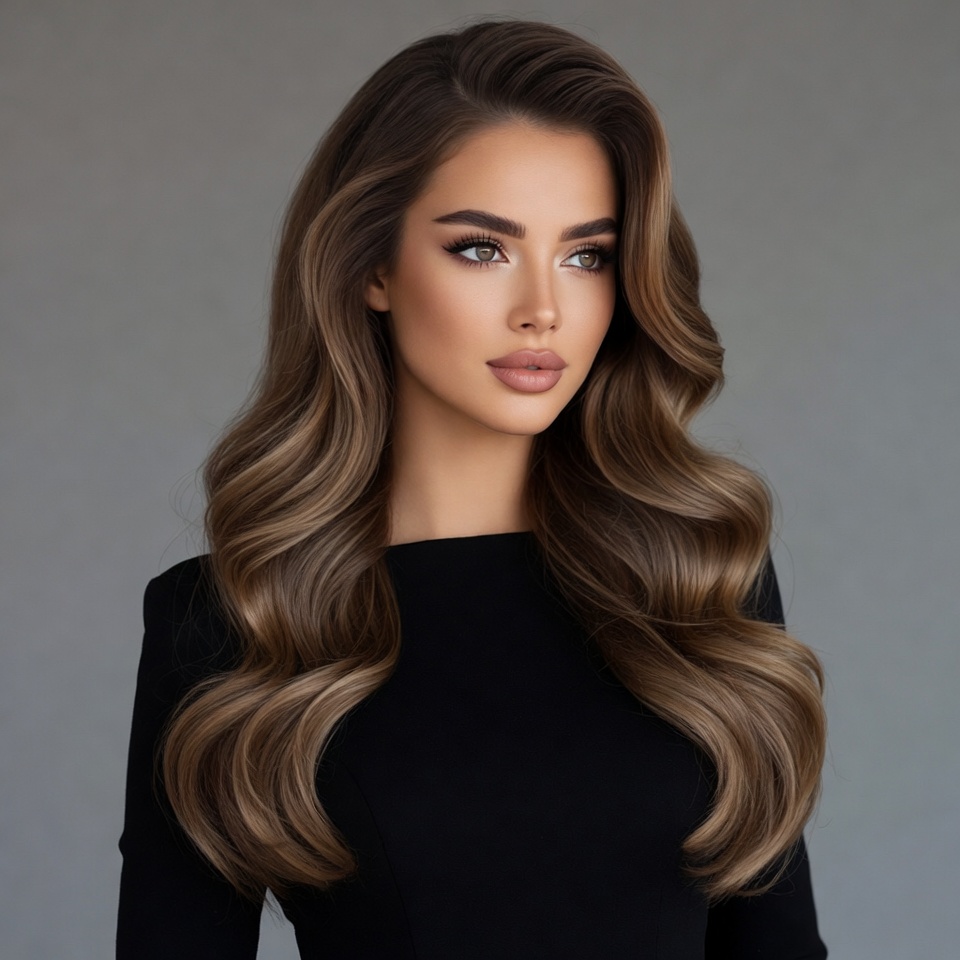 A beautiful woman with long, voluminous wavy brown hair looks to the side against a gray background. She has striking makeup with defined eyes and full lips, wearing a sleek black off-shoulder dress. Her hair cascades over her shoulders in soft waves.