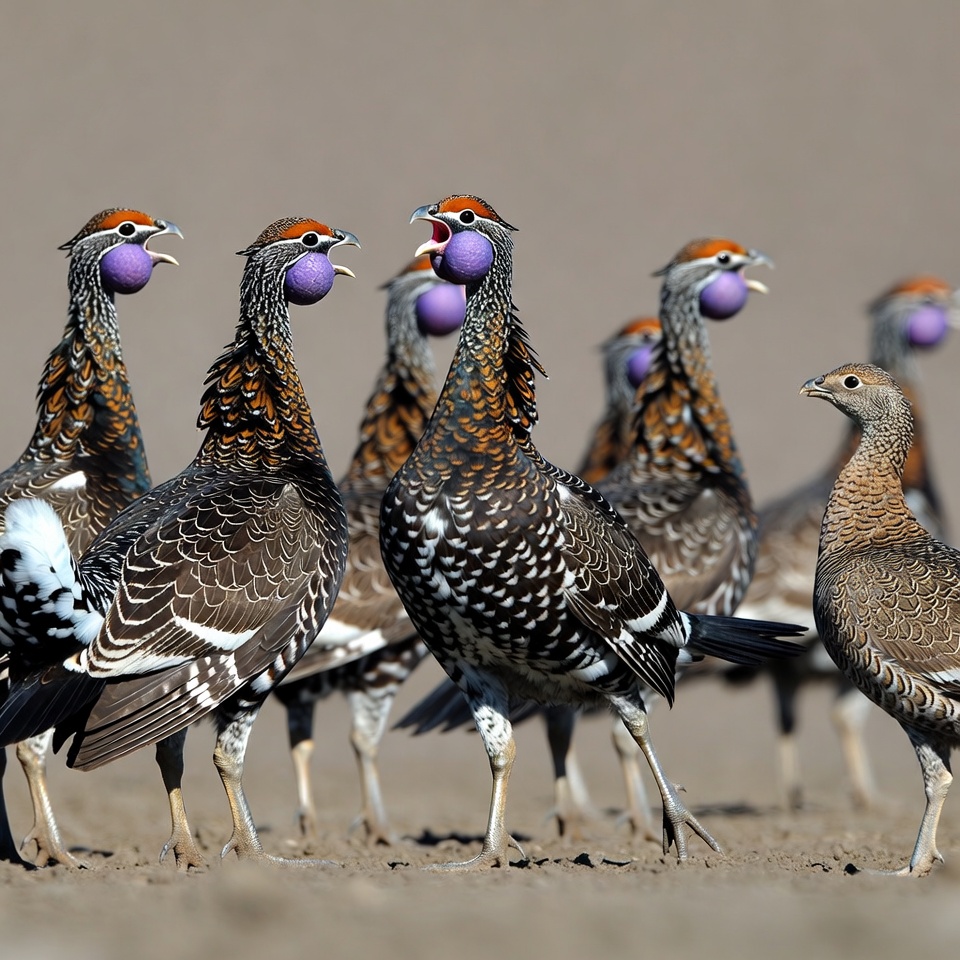 A group of Western Capercailzie birds stands together on a sandy ground, displaying their vibrant purple wattles and orange crests. Their feathers feature intricate patterns of black, white, brown, and rufous colors. Several males puff out their necks while a few females observe nearby.