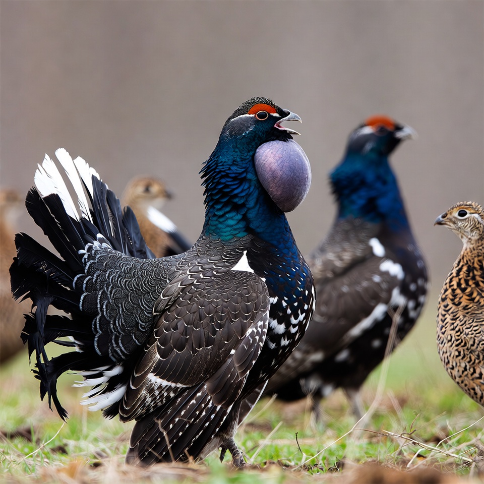 avian display, birds, courtship display, displaying grouse, feathers, female grouse, grass field, gray feathers, group of birds, grouse, iridescent blue, juvenile grouse, male grouse, natural habitat, purple throat sack, quail-like birds, red eye patch, white markings, wild birds, wildlife, blue grouse