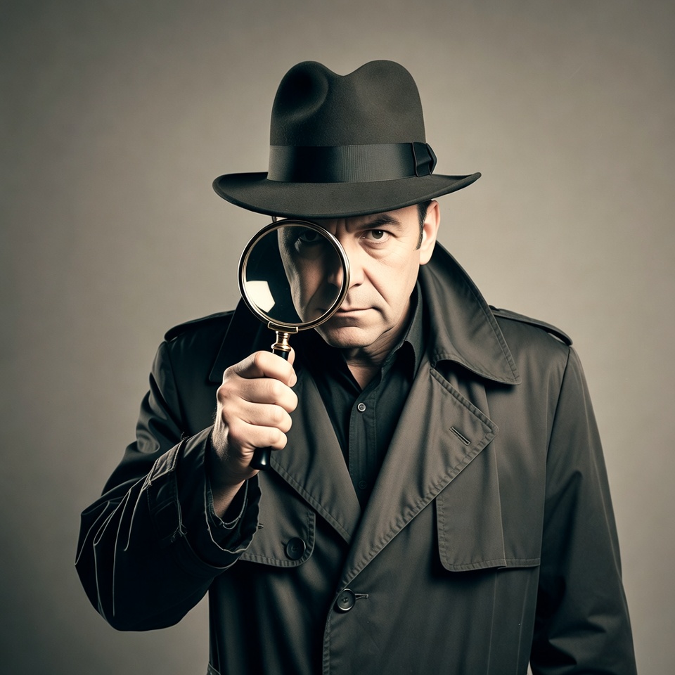 A man dressed as a detective wears a fedora hat and trench coat while holding a large magnifying glass to his eye. He has a serious expression and grips the handle firmly with his right hand. The image features a sepia-toned style against a plain gray background.