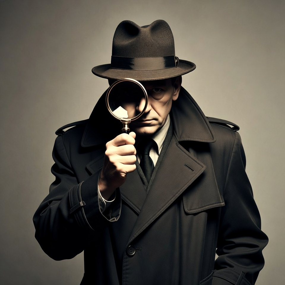 A man dressed as a detective in a trench coat and fedora hat holds a magnifying glass to his eye. He has a serious expression and wears a suit with a tie underneath the coat. The image is set against a plain gray background.