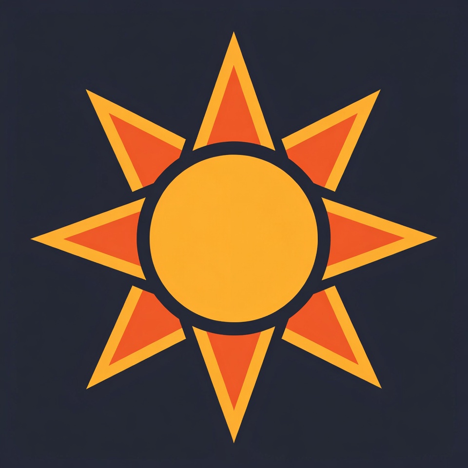 A vibrant yellow sun icon with eight sharp orange rays on a dark blue background. The sun features a solid yellow circular center outlined in orange. It has a flat, cartoonish illustration style.