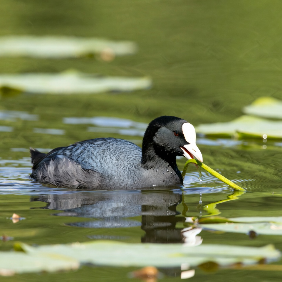 aquatic bird, bird, black bird, eating plant, green water, lily pads, nature, red bill, swimming bird, water bird, water plant, wetland bird, white shield, wildlife, coot
