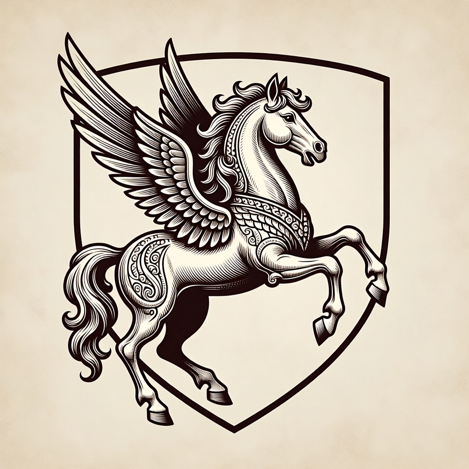 beige background, crest, detailed drawing, emblem, engraving, fantasy animal, feathers, flying horse, heraldry, horse, illustration, isolated background, line art, mane, mythical creature, ornate, rearing horse, shield, vector art, vintage, winged horse, wings, Pegasus