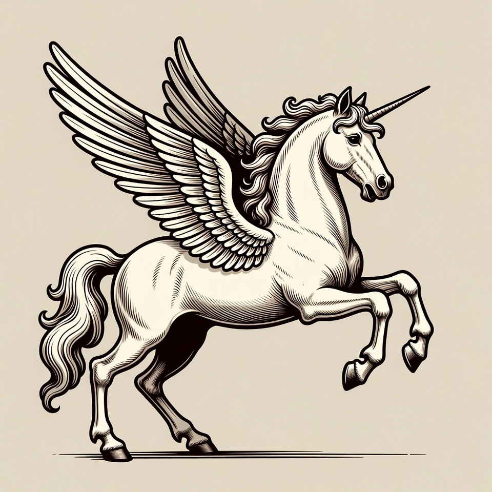 beige background, clipart, engraving, fantasy animal, feathered wings, flowing mane, flying horse, illustration, isolated background, line art, majestic unicorn, mythical creature, pegasus, rearing horse, spiraled horn, tail, unicorn, vector art, white horse, winged unicorn