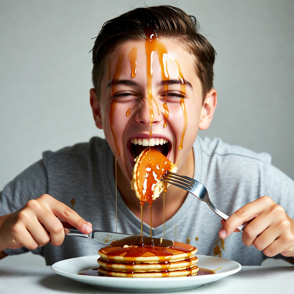 White, breakfast, brown hair, delicious, dripping syrup, eating, food, fork, gray shirt, grinning, hands holding fork, isolated background, male, messy face, mouth open, pancakes, plate, short hair, smiling, stack of pancakes, syrup, teeth, young boy, boy