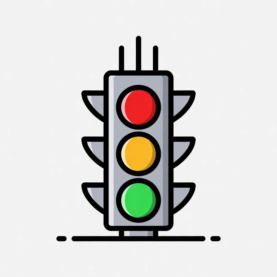 A colorful flat illustration of a traffic light on a white background with isolated shadow. It features three circular lights: red on top, yellow in the middle, and green at the bottom. The design uses simple lines and bold colors.