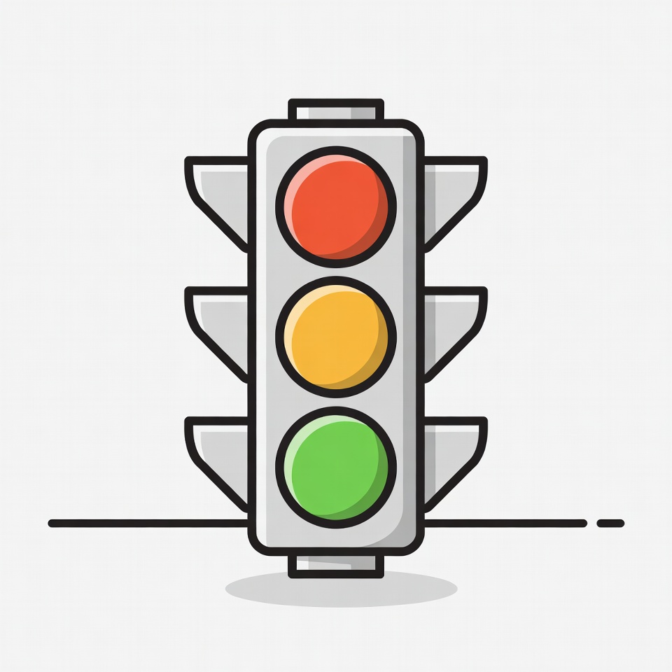 A simple flat illustration of a traffic light on a white background shows the red light illuminated at the top, with yellow in the middle and green at the bottom. The design features clean black outlines and vibrant colors. It stands isolated with a subtle shadow beneath.