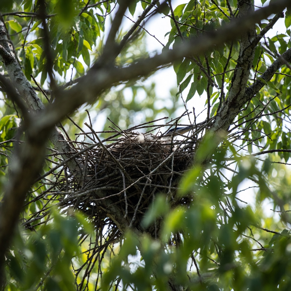 A nest made of twigs and branches sits high in a tree surrounded by green leaves. Several small birds with light feathers are visible inside the nest. Sunlight filters through the foliage, highlighting the natural setting.