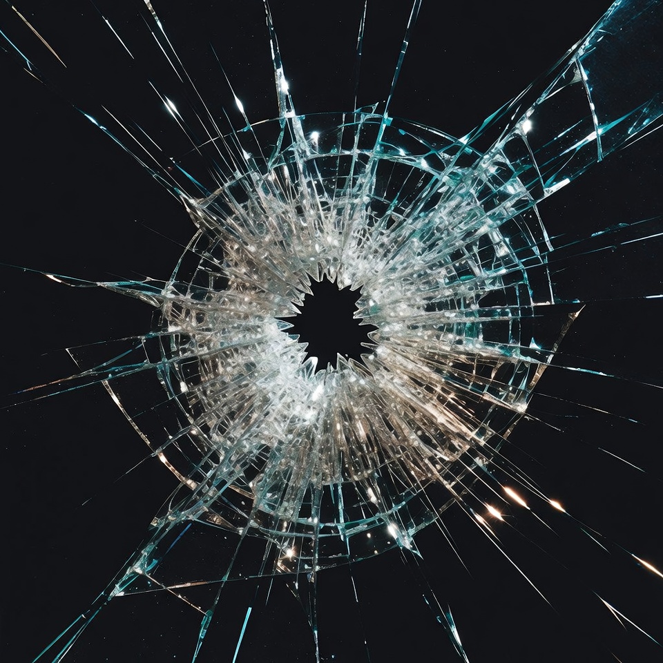 broken glass, broken window, close-up, cracked glass, dark background, destruction, fracture, glass crack, glass fragments, glass hole, glass shards, glossy shards, impact hole, pattern, radial cracks, sharp glass, splintered glass, texture, transparent glass, shattered glass