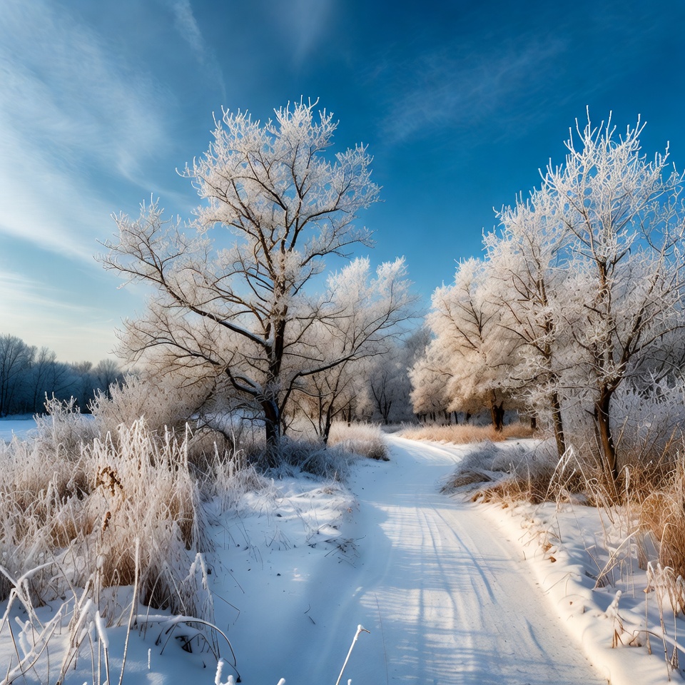 bare trees, blue sky, cold weather, crisp snow, frost grass, frosted trees, frosty nature, frozen branches, frozen landscape, hoarfrost, ice crystals, icy trees, nature path, outdoor winter, snow covered, snow scene, snowy bushes, snowy field, snowy path, snowy trail, snowy woods, white trees, winter scenery, winter trail, winter trees, winter walk, winter wonderland, winter landscape
