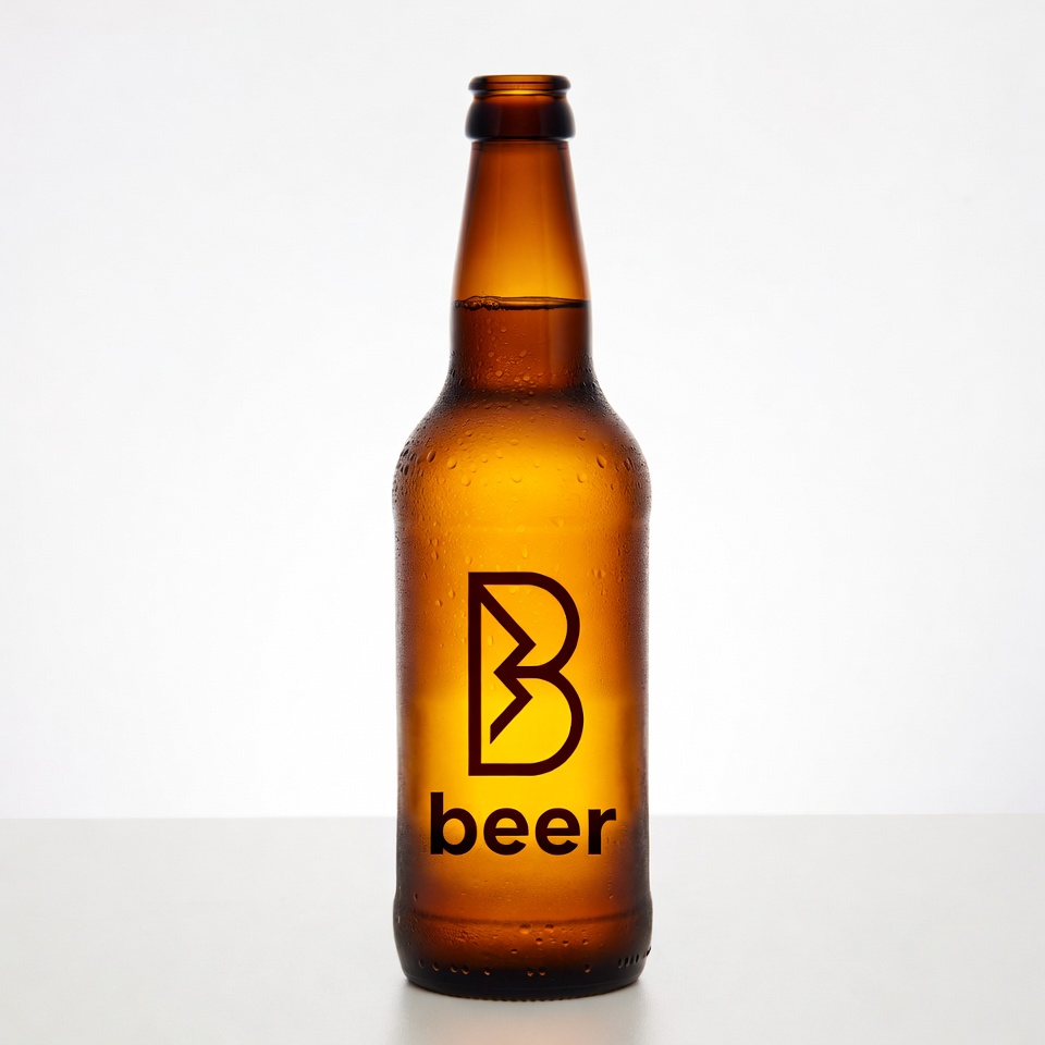 B logo, alcohol, beer, beverage, brown bottle, cap, condensation, drink, droplets, glass bottle, isolated background, product shot, studio photo, transparent glass, white background, beer bottle
