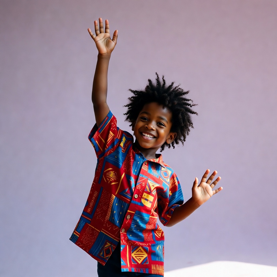 A young Black boy with curly afro hair stands against a purple background, raising both hands joyfully. He wears a colorful short-sleeved shirt featuring red, blue, yellow, and geometric patterns. He smiles broadly, showing excitement.