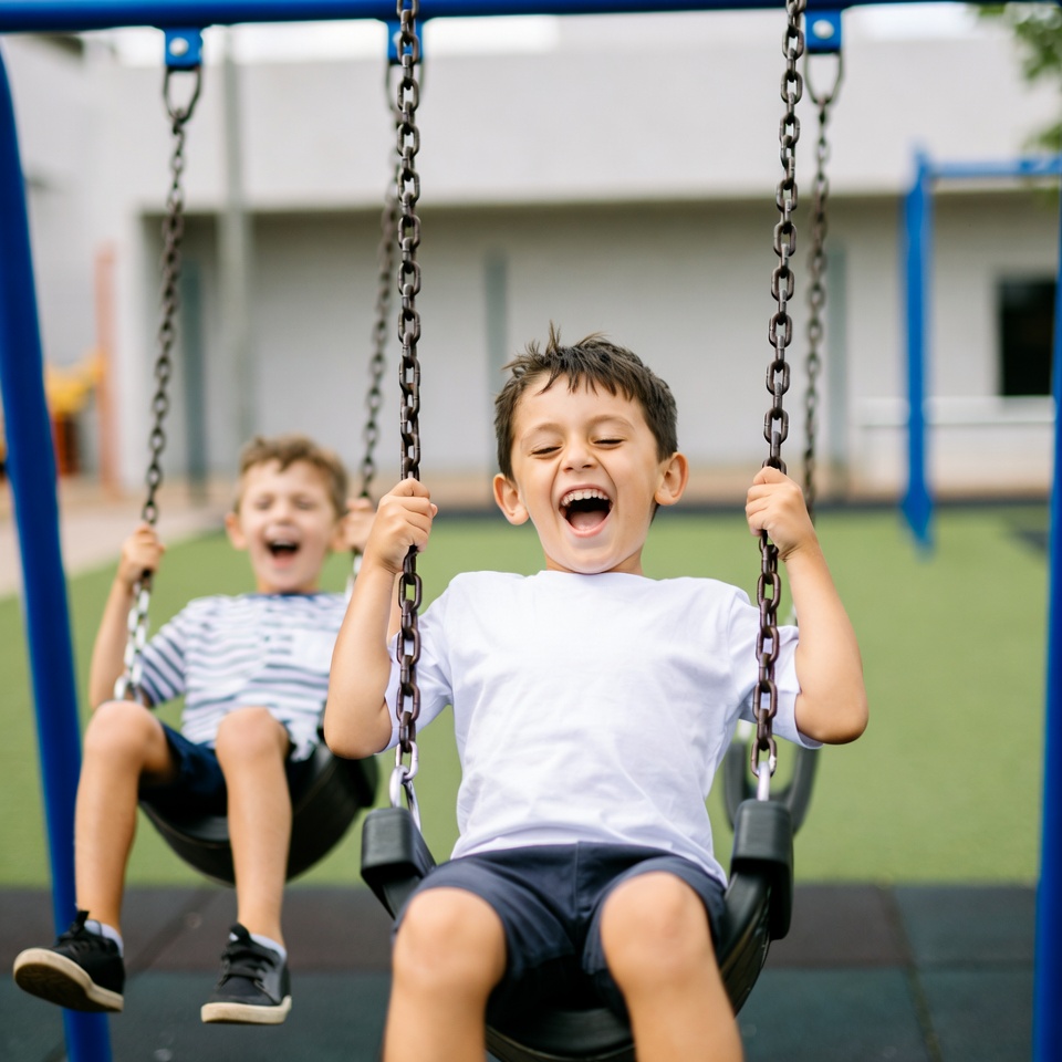 Two young boys with short brown hair are joyfully swinging on black swings at a playground. The boy in the foreground wears a white t-shirt and blue shorts, laughing widely while gripping the chains. The boy behind him wears a striped shirt and shorts, smiling as they swing over green grass with a blue metal frame and building in the background.